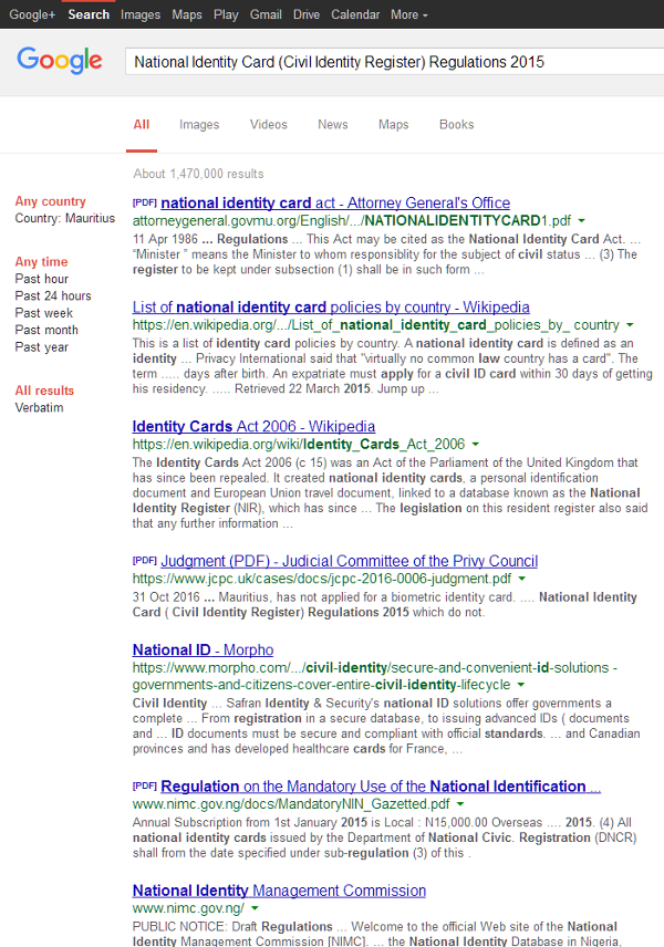 The assurance seems light when it is weighed against the survey of legal exceptions and the conclusion reached. Information about the data sharing arrangements between government agencies was not publicized in Mauritius. Is it practical for a citizen to read all the relevant laws to know which government agencies can use that data as there is a legal requirement? A search for the "National Identity Card (Civil Identity Register) Regulations 2015" returned the following search results: