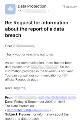I informed the data controller that there was a report on LinkedIn about a data breach. I tried to find out whether any of the subscriber data types mentioned in the report were shared with third-parties, and whether any of the third-parties reported a breach.